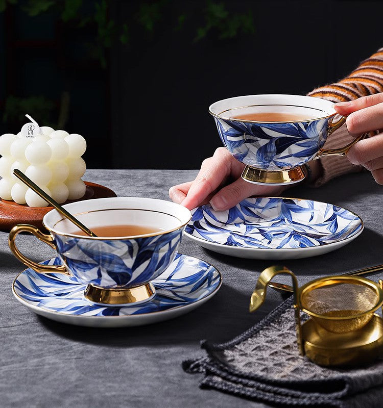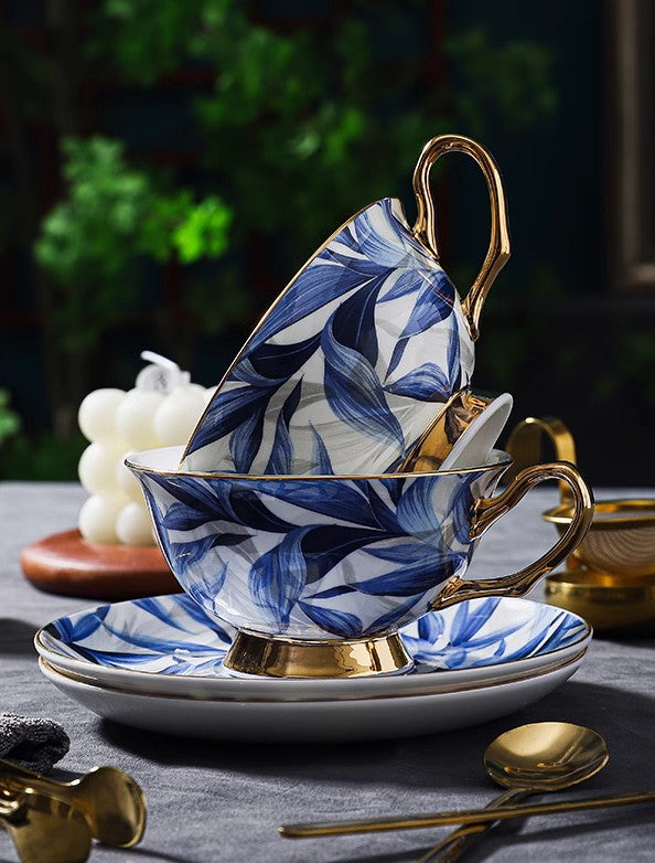 Blue Bone China Porcelain Tea Cup Set, Elegant British Ceramic Coffee Cups, Unique British Tea Cup and Saucer in Gift Box