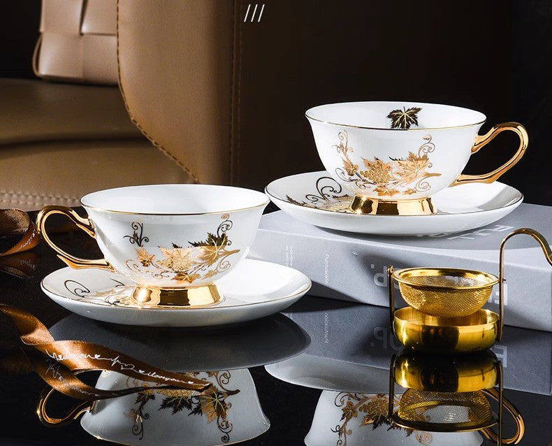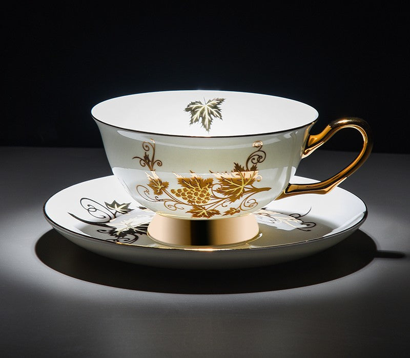Golden Leaves and Grapes Bone China Porcelain Tea Cup Set, Unique British Tea Cup and Saucer in Gift Box, Elegant British Ceramic Coffee Cups