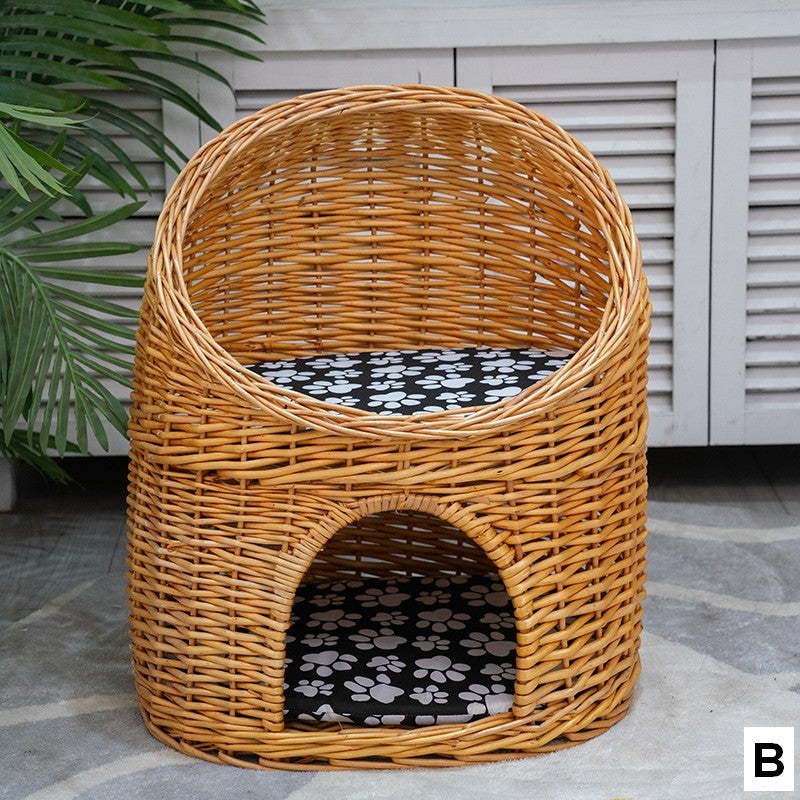 Wicker Cat House Basket with Washable Cushion for Indoor Cats and Dogs, Rattan Cat Bed