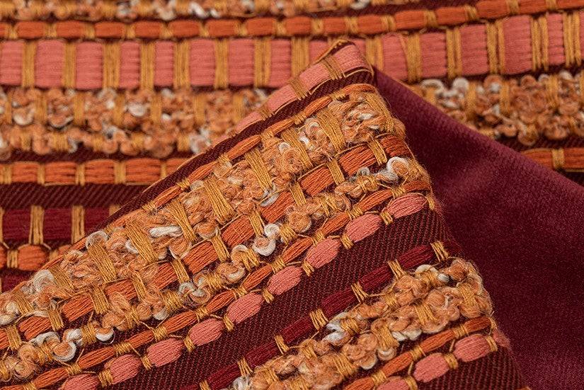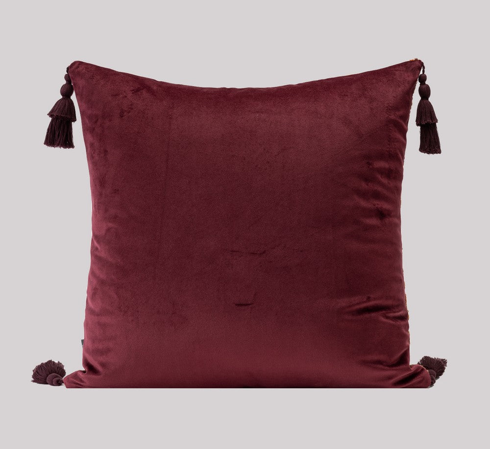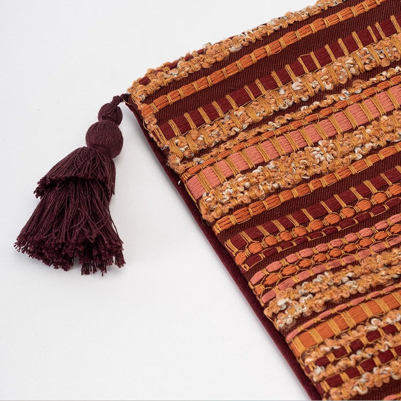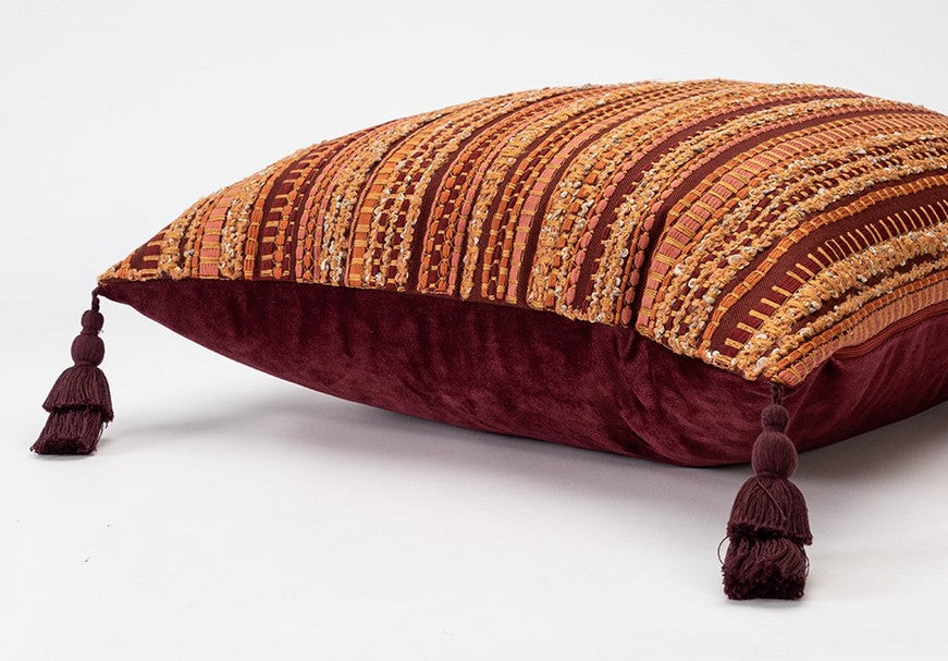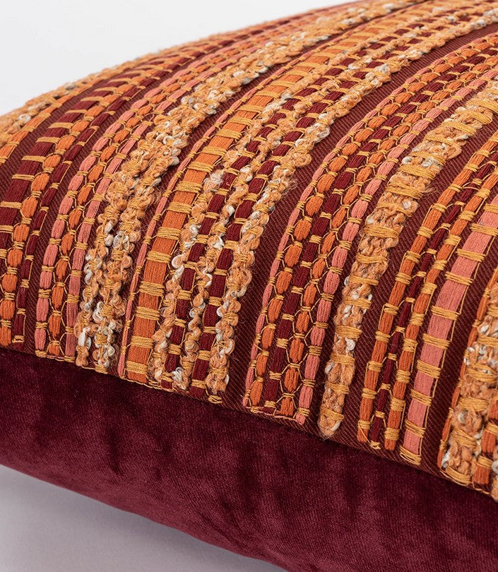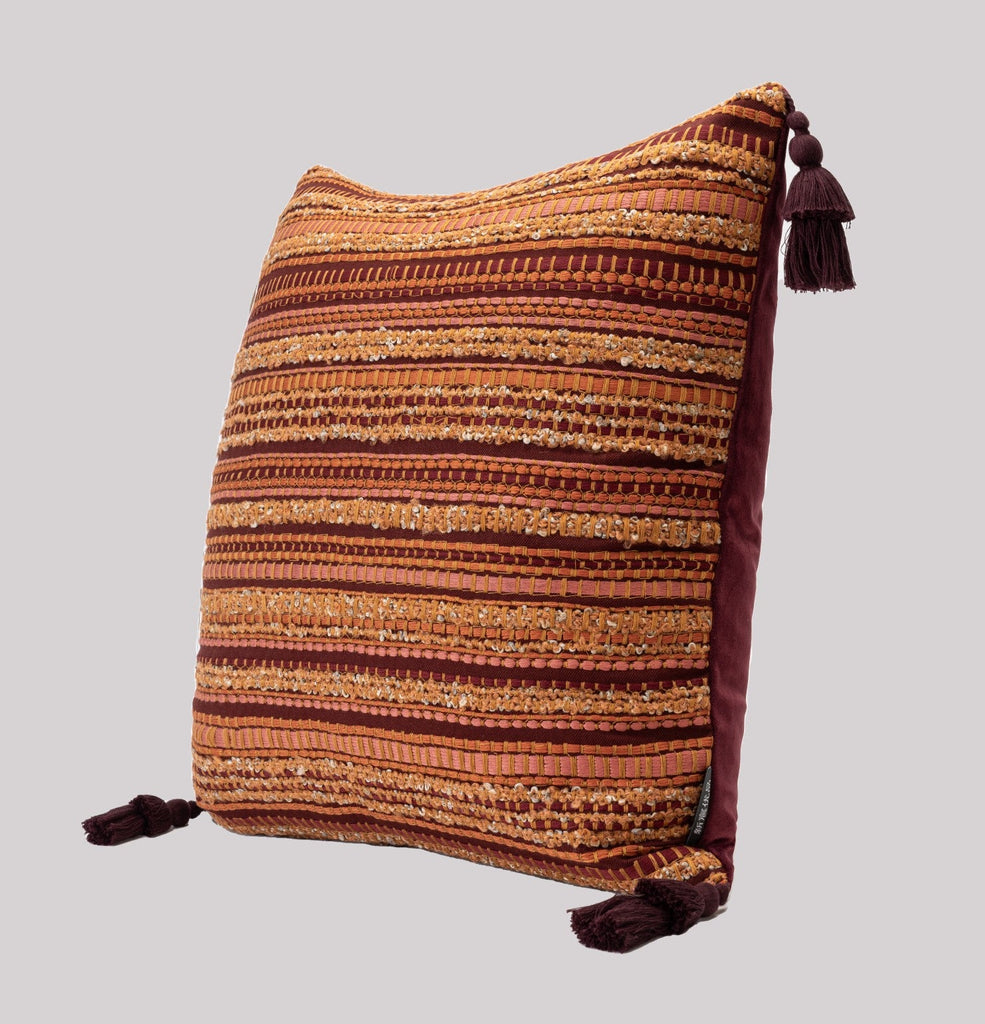 This cushion, a harmonious blend of warm earthy tones, weaves together rich maroon, amber, and terracotta hues in intricate striped patterns. Its soft, inviting texture invites you to sink into comfort, while its bold design transforms any space into a cozy, artistic haven.