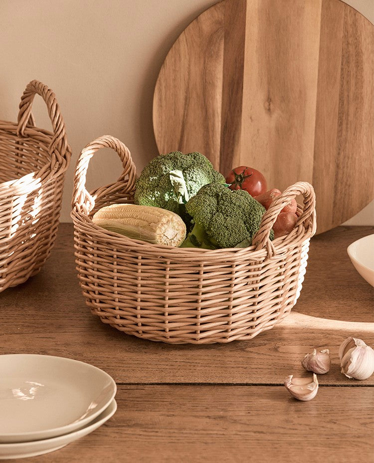 Picnic Fruit Basket with Handle, Kitchen Storage Baskets, Natural Hand-woven Wicker Round Storage Basket, Lovely Willow Weaving Baskets for Vegetable, Natural Fruit Storage Basket