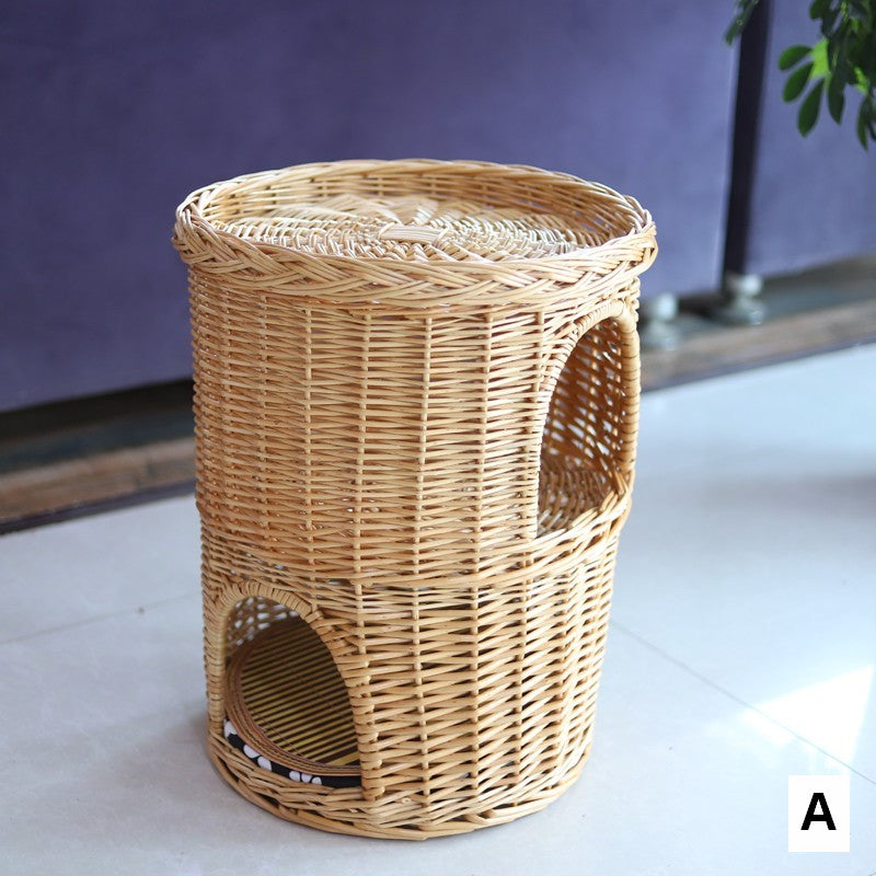 Wicker Cat House Basket with Washable Cushion for Indoor Cats and Dogs, Rattan Cat Bed